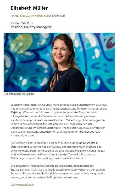 Elisabeth Müller hat die Leitung für Österreich bei ESG Plus übernommen, einem Sozialunternehmen im Sustainable Finance Bereich. Zuvor war sie für mehrere Jahre für die Umsetzung von internationalen UNO-Projekten verantwortlich.