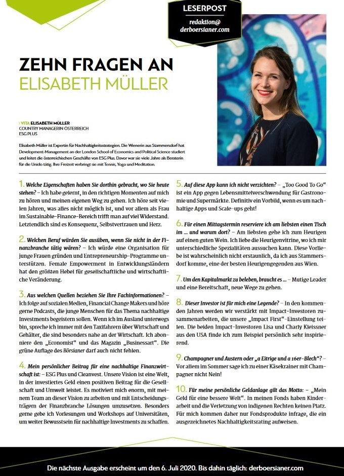 Der Finanzmarkt hat eine enorme Hebelwirkung und kann maßgeblich zu einer positiven Veränderung im Bereich Umwelt- und Klimaschutz beitragen. Wie das geht? Darüber haben wir mit Elisabeth Müller, Country Managerin und Nachhaltigkeits-Expertin von ESG Plus und CLEANVEST gesprochen.